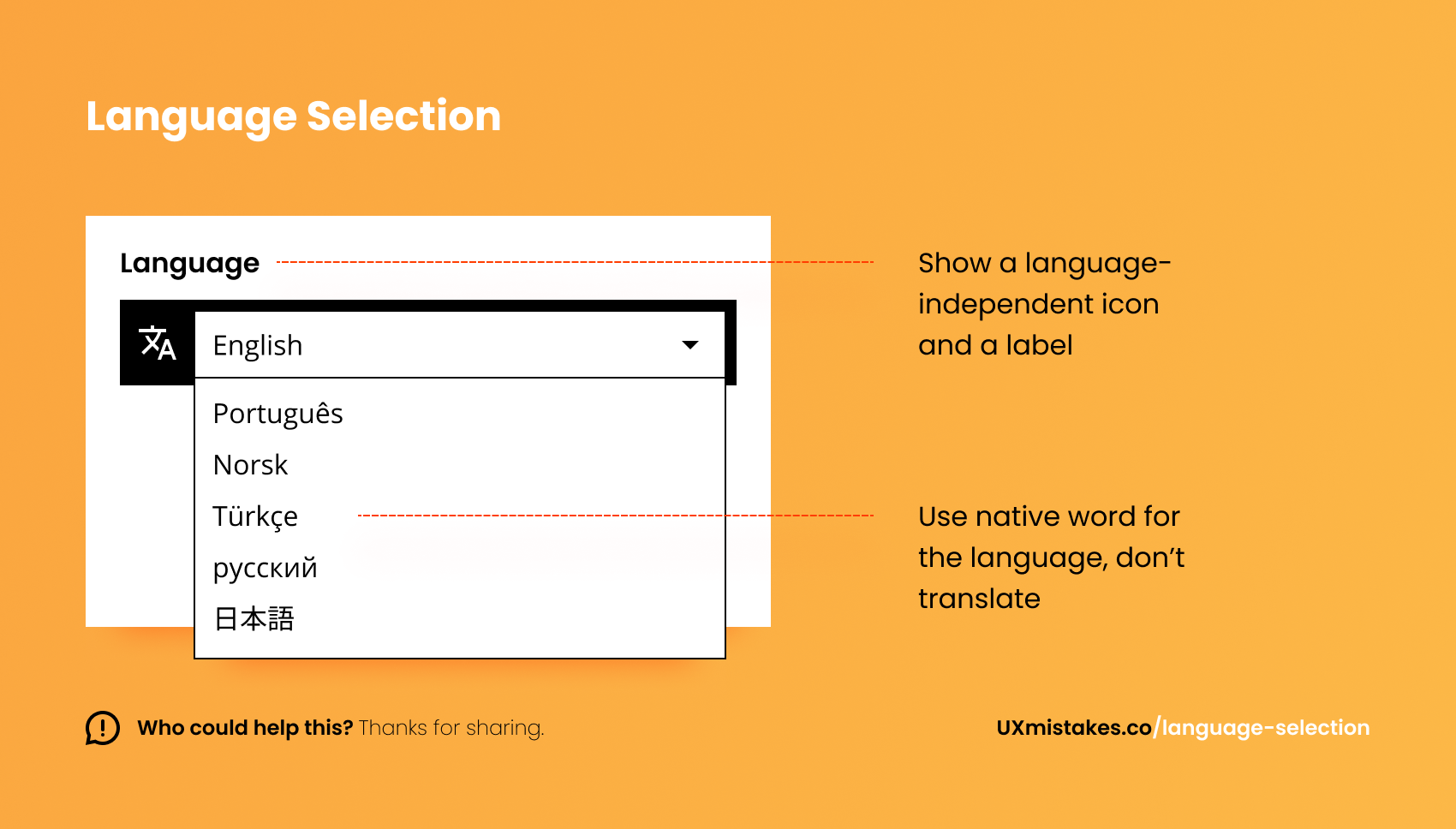 Make sure you don’t translate the language selection. Use an icon that helps users find the selection without reading.