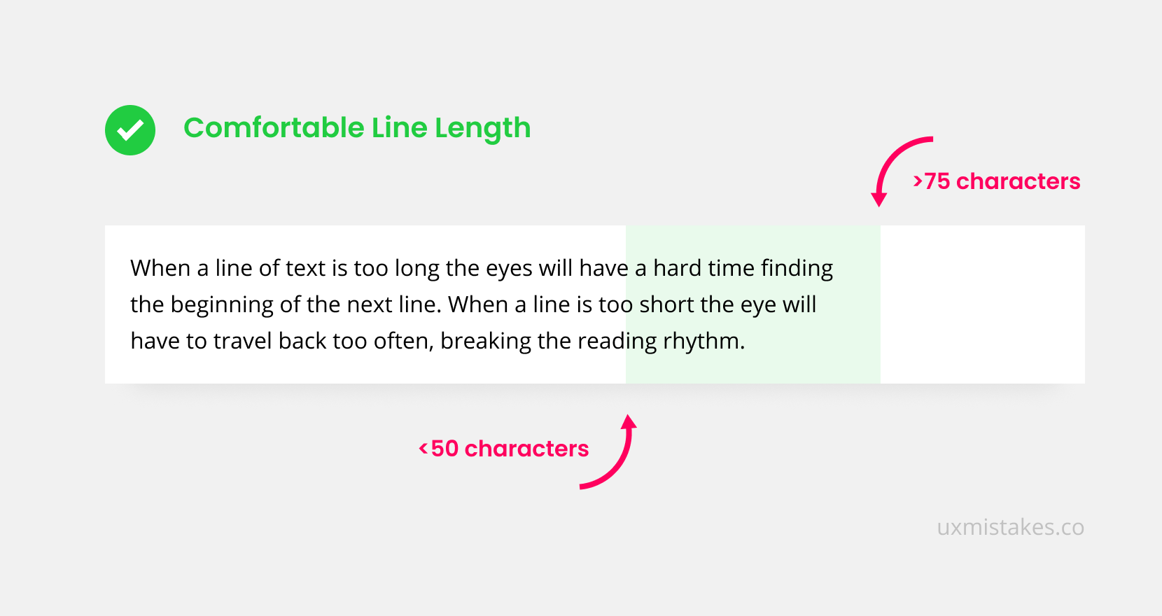 For long content blocks, design the length of text to 50–75 characters per line (including spaces).