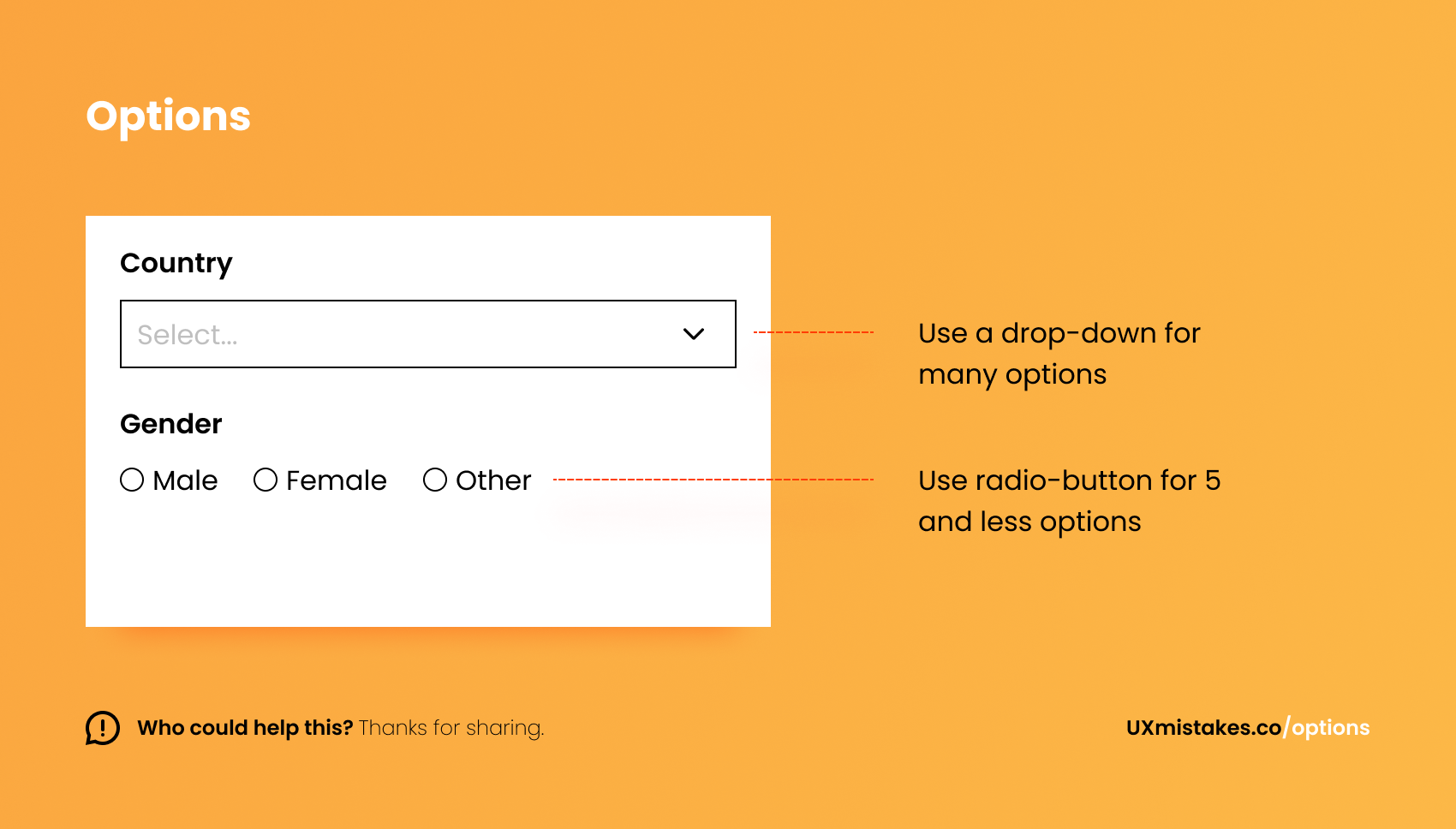 Use Radio-buttons for a few options like the selection of gender. Use Drop-downs for many options like a selection of a country.