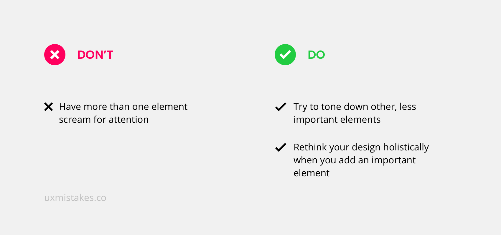 Over time, elements need to increase the visual volume to compete with all the other elements. This results in a cluttered interface that overwhelms users.