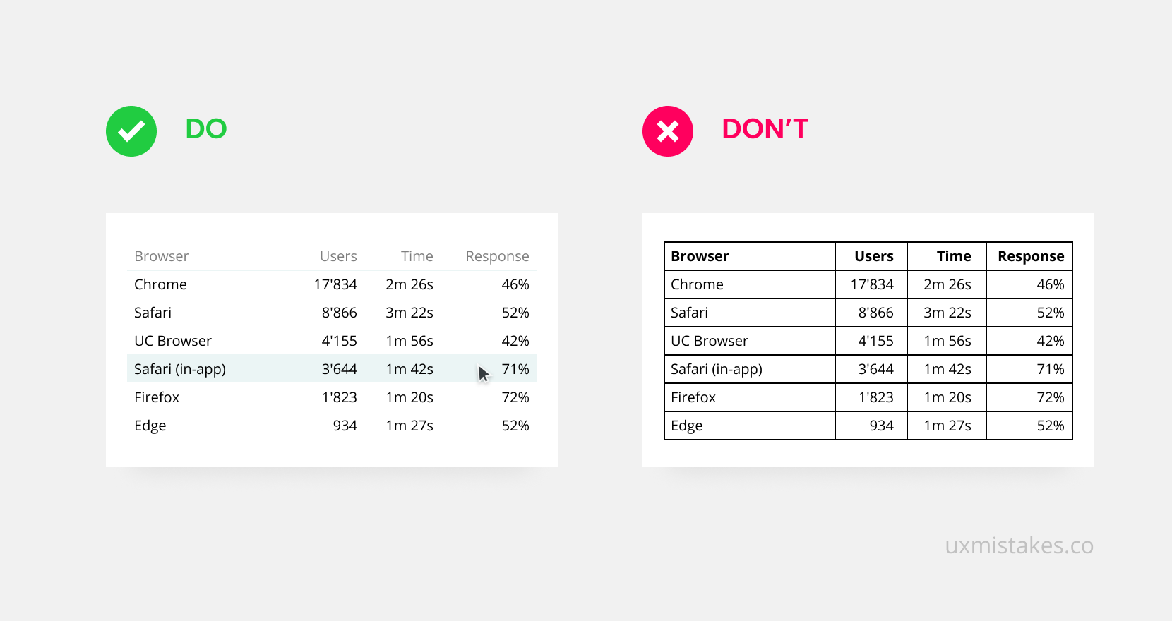 Data tables help digest large amounts of information. They are visually quite busy and we need to help the viewer to easily scan the content.